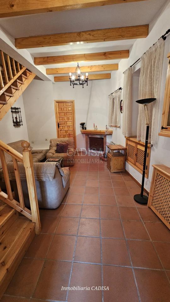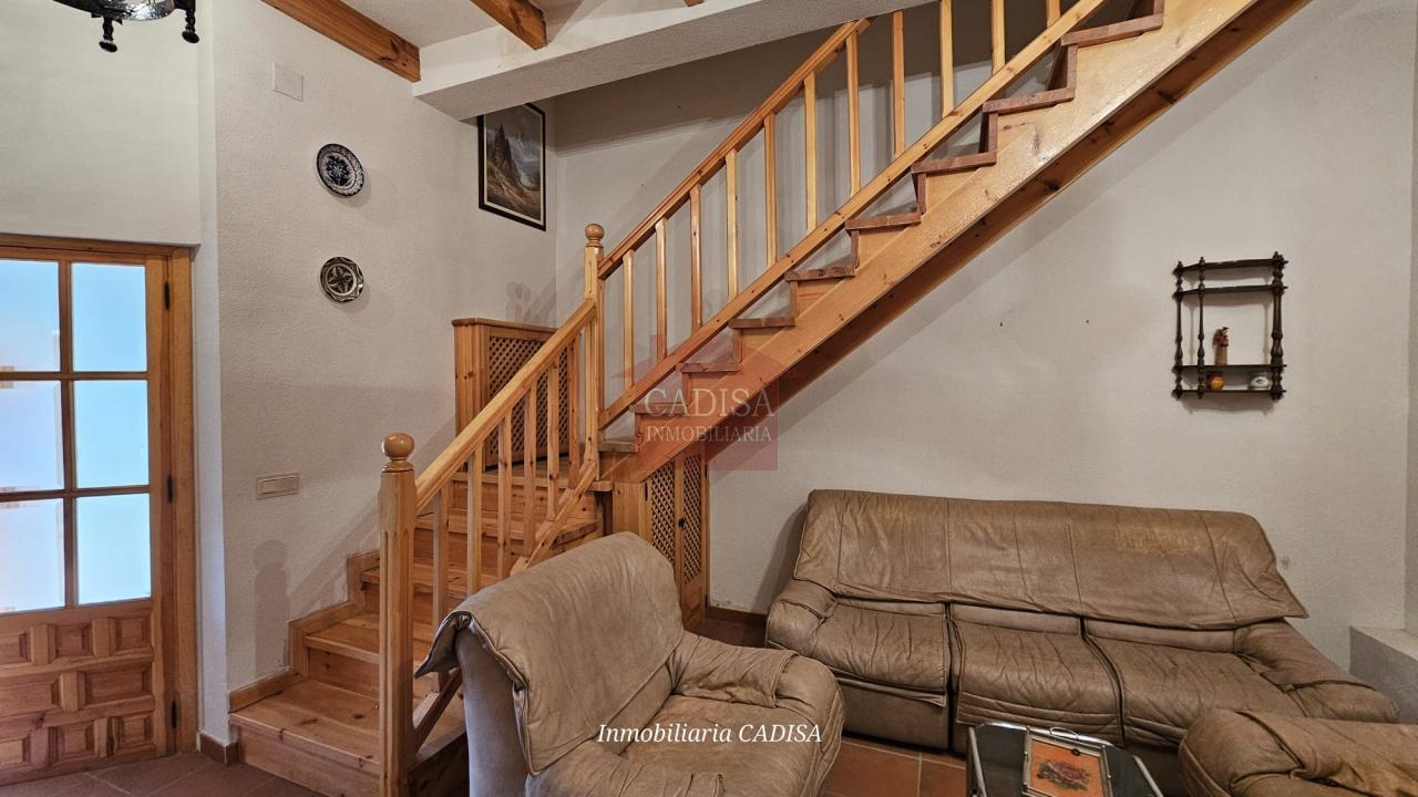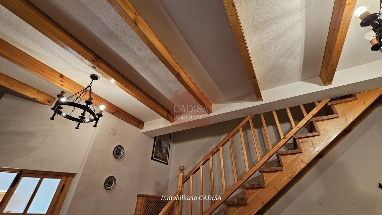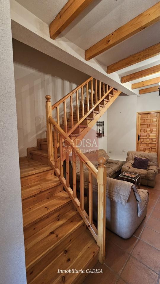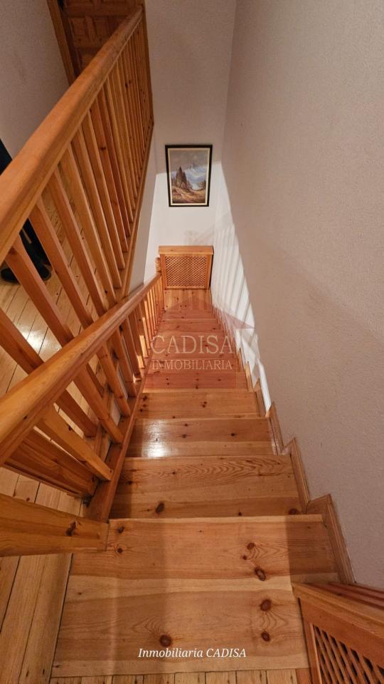 Escaleras de madera, chimenea en el salón, ventanas de madera, suelos y puertas de madera de pino...